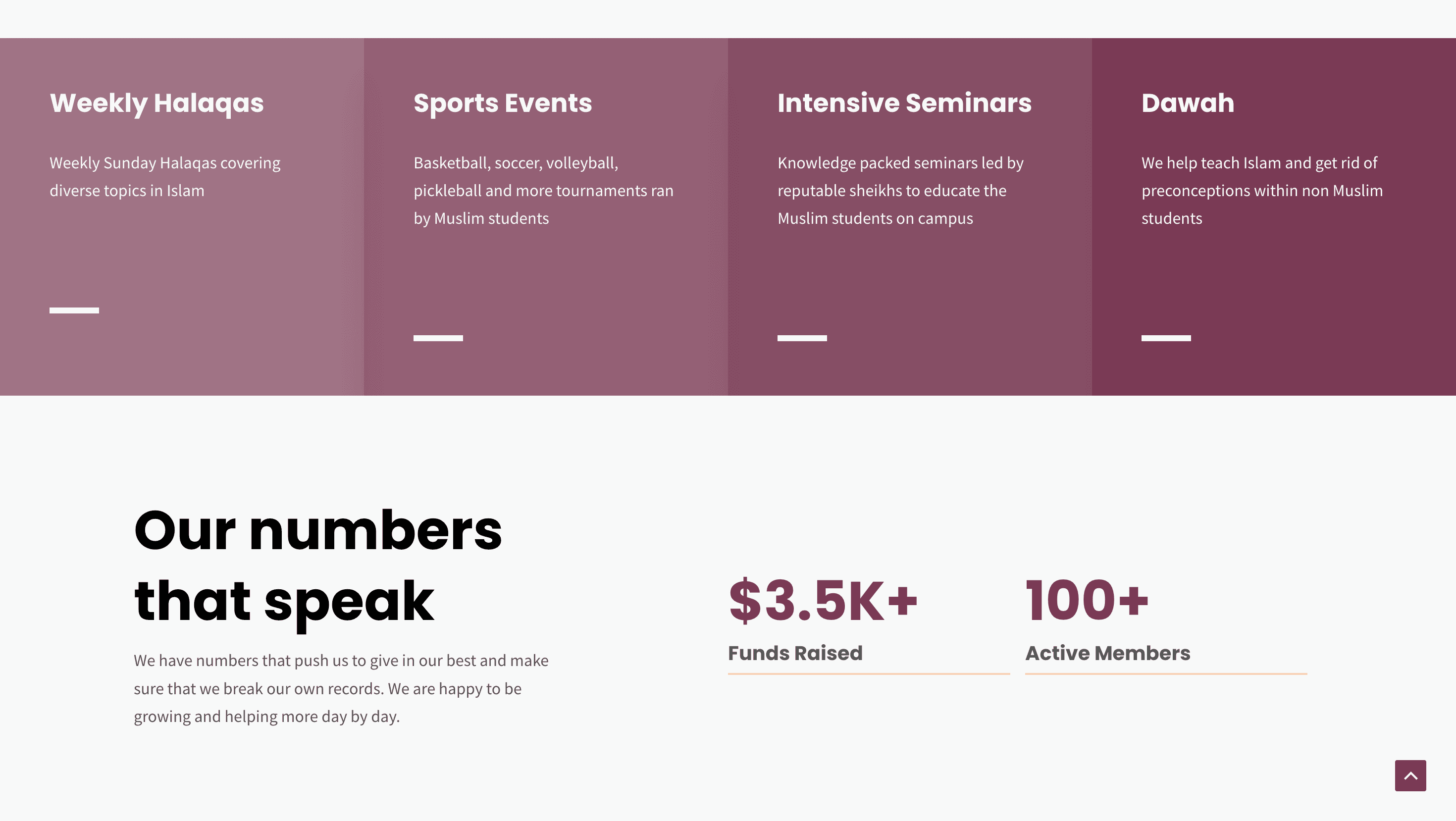 Separate pages for events, donations, and organizational transparency